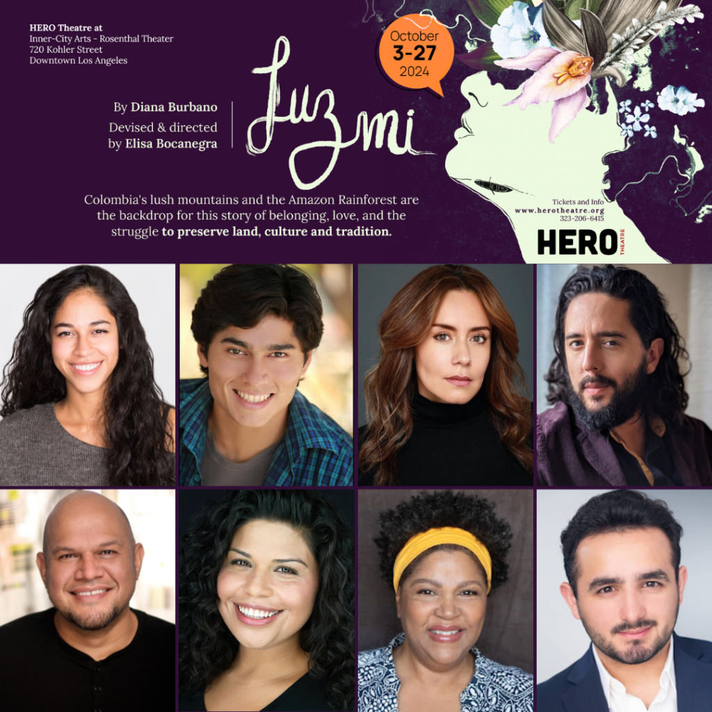 (August 19, 2024) HERO Theatre announces the cast for the world premiere of Luzmi by Diana Burbano, performing at The Rosenthal Theater at Inner-City Arts in Los Angeles. Luzmi, devised and directed by HERO Theatre Producing Artistic Director Elisa Bocanegra, marks the U.S. premiere of HERO Theatre and HERO Multimedia’s Nuestro Planeta, a new works commissioning initiative rooted in research around environmental justice issues happening in Latine countries and how Latine American families are directly affected.